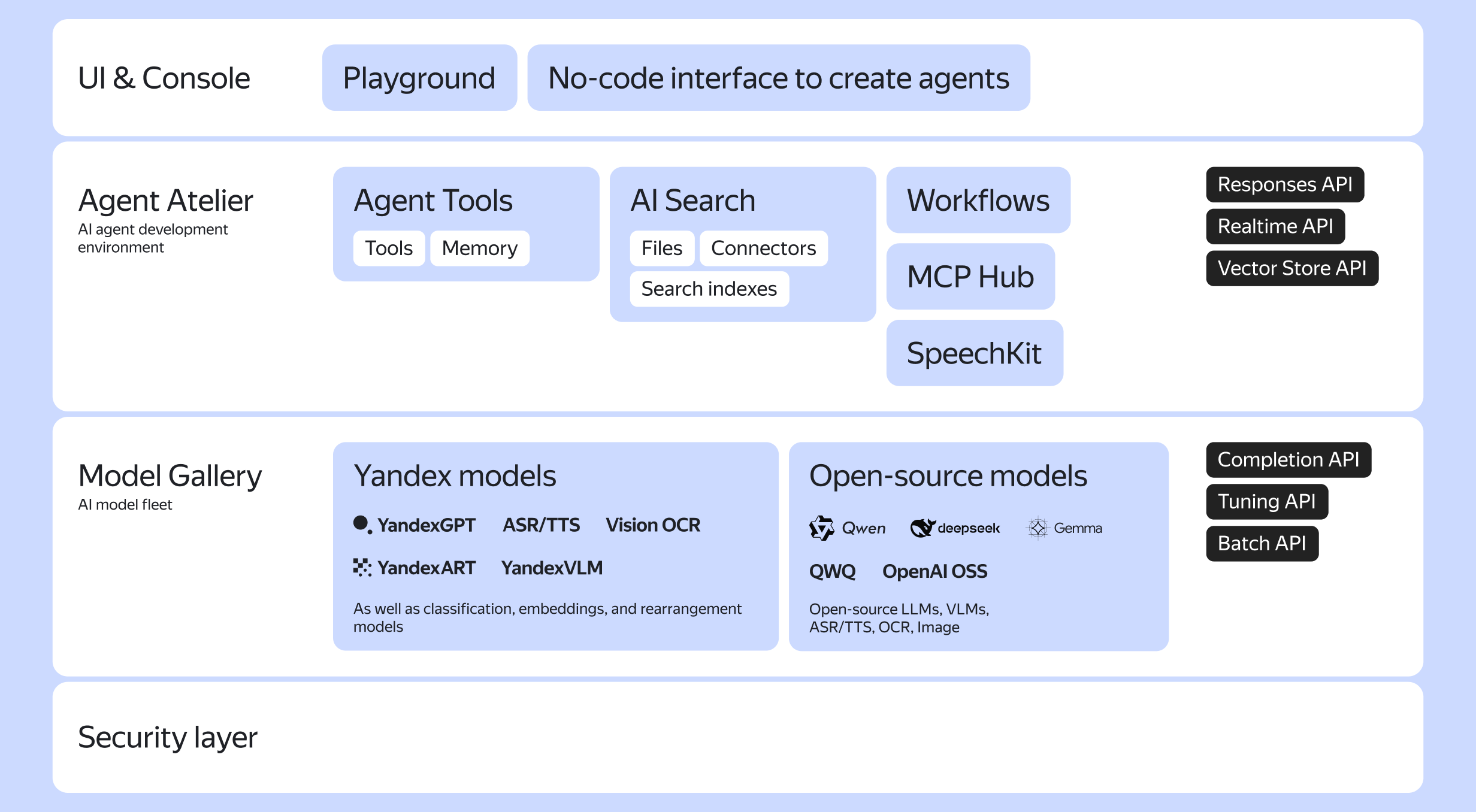 The platform features Yandex’s next-gen generative neural networks and speech recognition and synthesis models, as well as up-to-date open-source LLMs and VLMs, such as Qwen, OpenAI OSS, and DeepSeek.