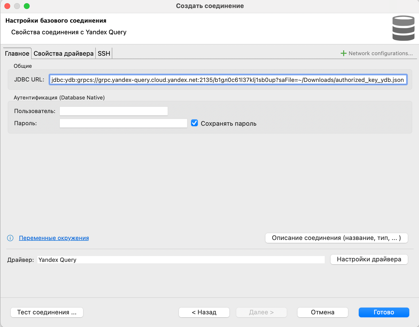 jdbc:ydb:grpcs://grpc.yandex-query.cloud.yandex.net:2135/<folder_id>?saFile=<path_to_auth_key_file.json>&useQueryService=falseWhere: