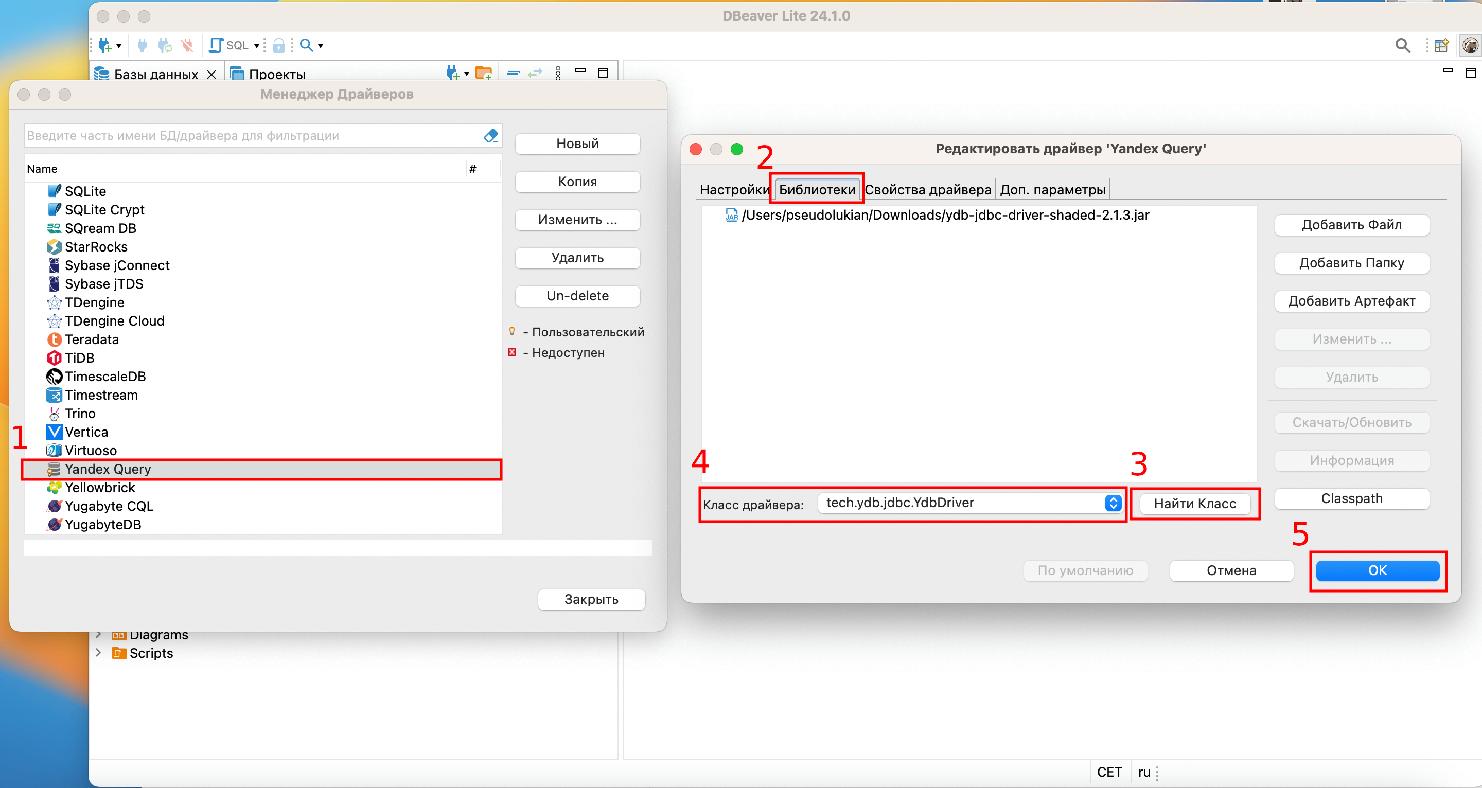 The Yandex Query driver will appear in the driver list. Double click the new driver and go to the Libraries tab, click Find Class and select