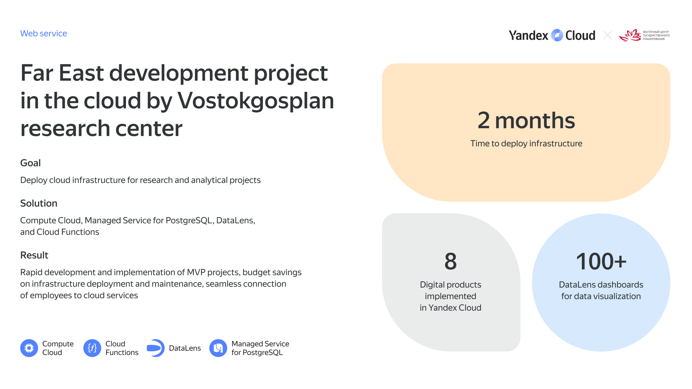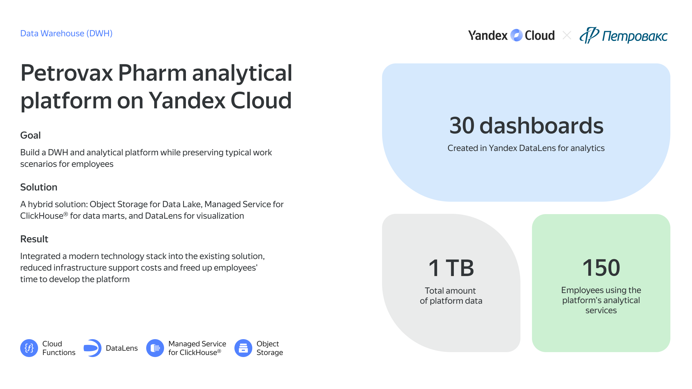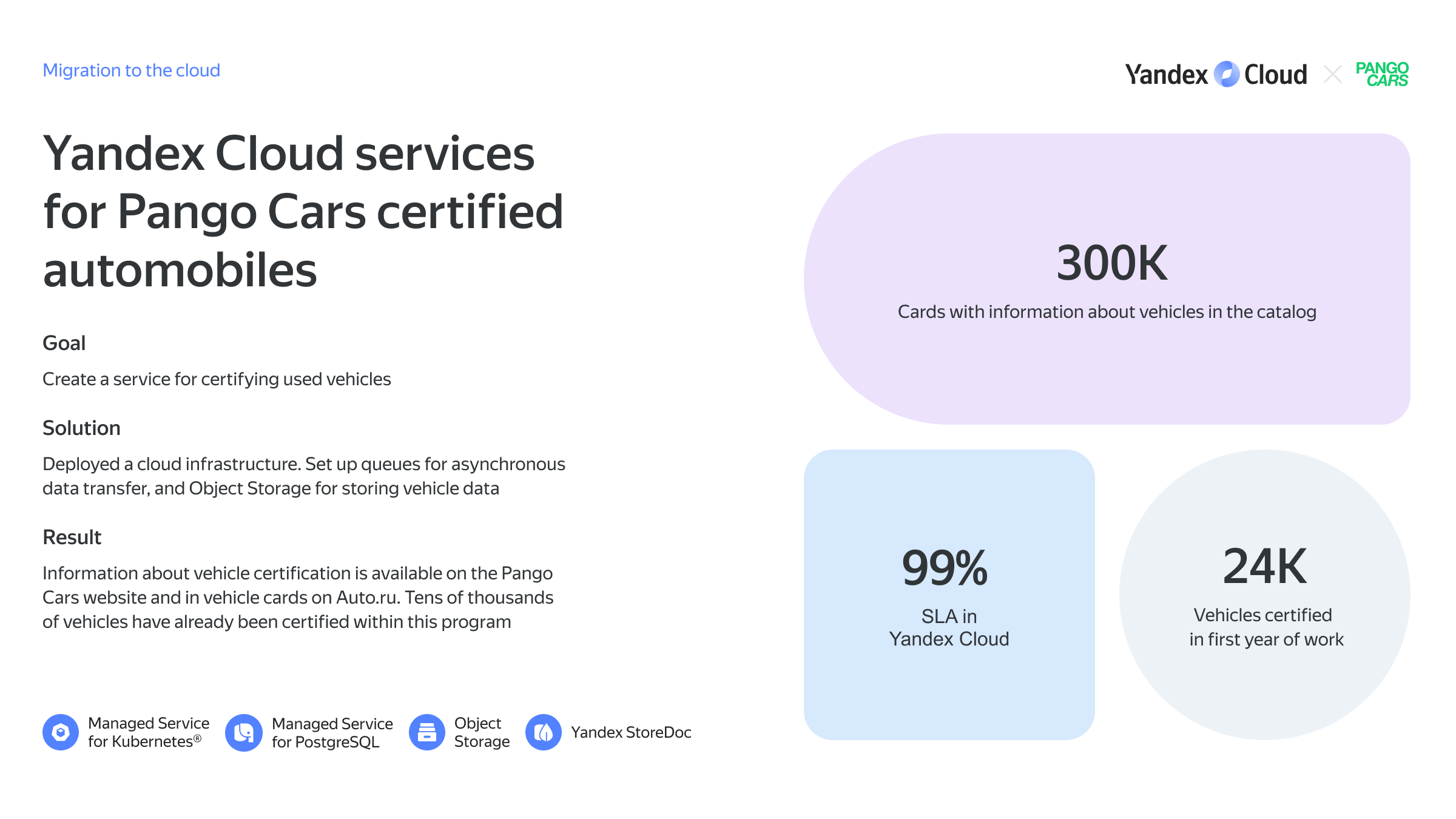 Store your Russian users' personal data in Yandex Cloud’s infrastructure, in full compliance with local legislation (Federal Law № 152).