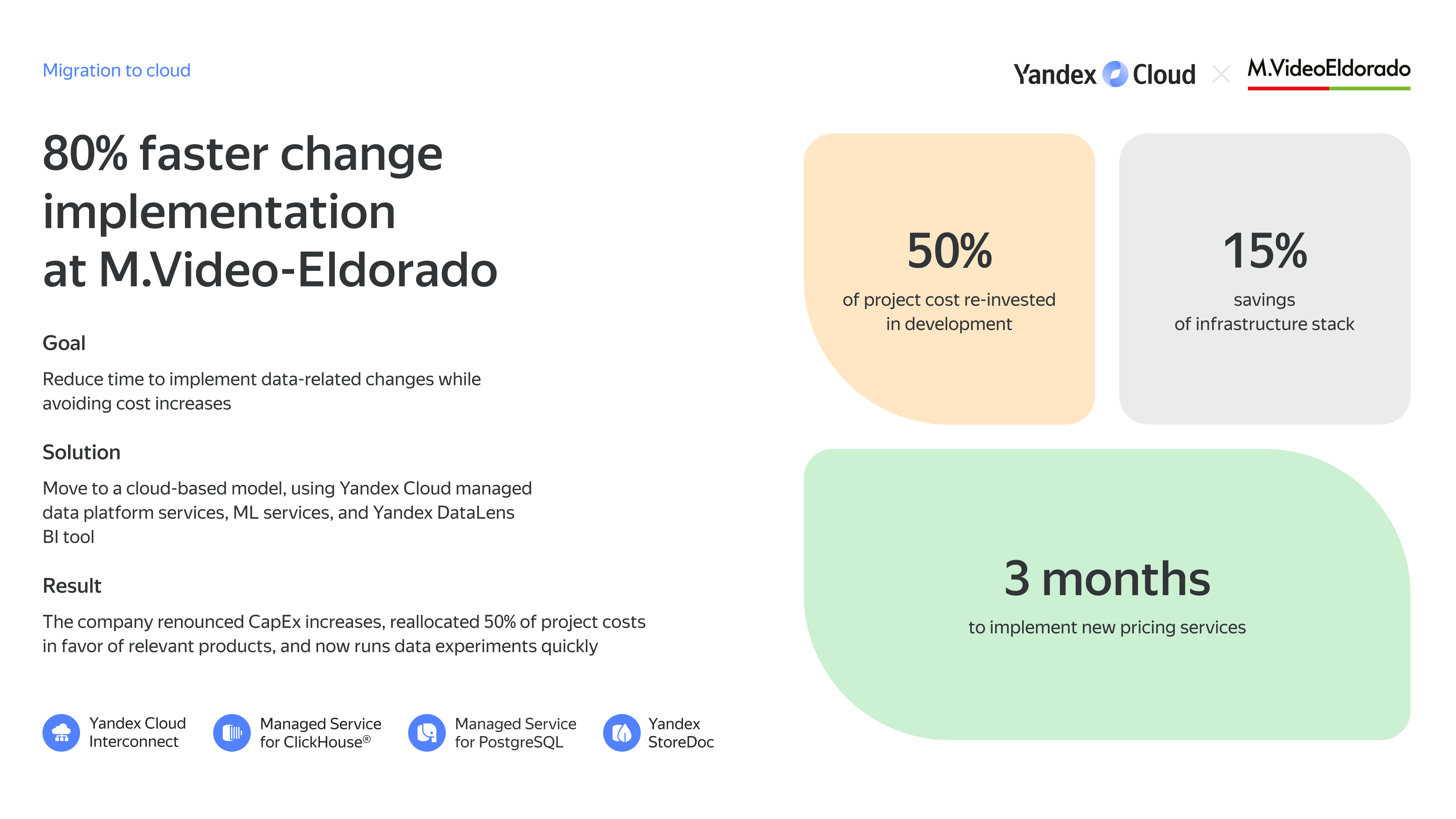 Our engineering team ensures the platform’s stable operation, contributes to major open-source data storage projects like PostgreSQL and ClickHouse®, and develops managed services already integrated into Yandex Mail, Yandex Taxi, and Yandex Drive.