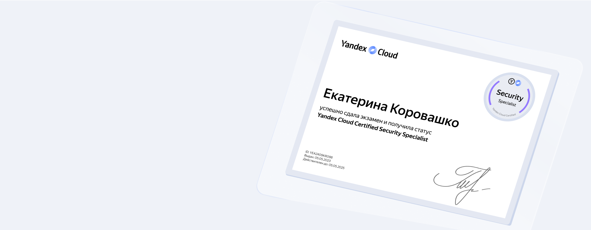 Экзамен для тех, кто выполняет задачи по защите облачных систем. Подтвердит ваши знания и навыки по работе с сервисами безопасности Yandex Cloud.