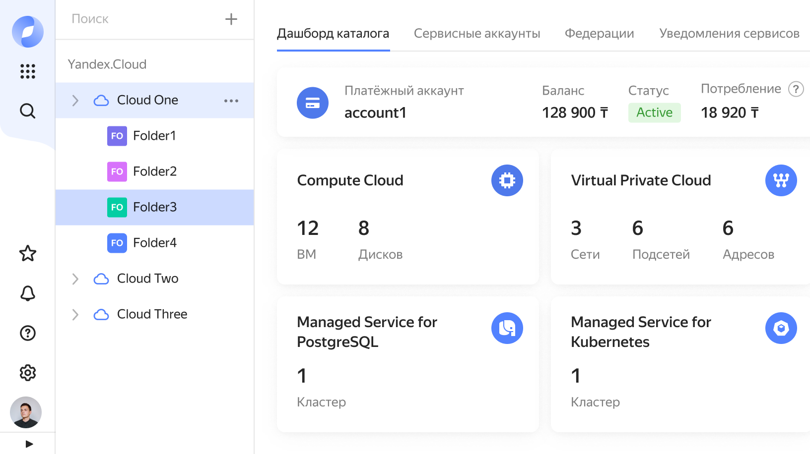 На дашборд каталога выводится вся важная информация: ваши облака, доступ ко всем сервисам Yandex Cloud, баланс аккаунта, уведомления и многое другое.