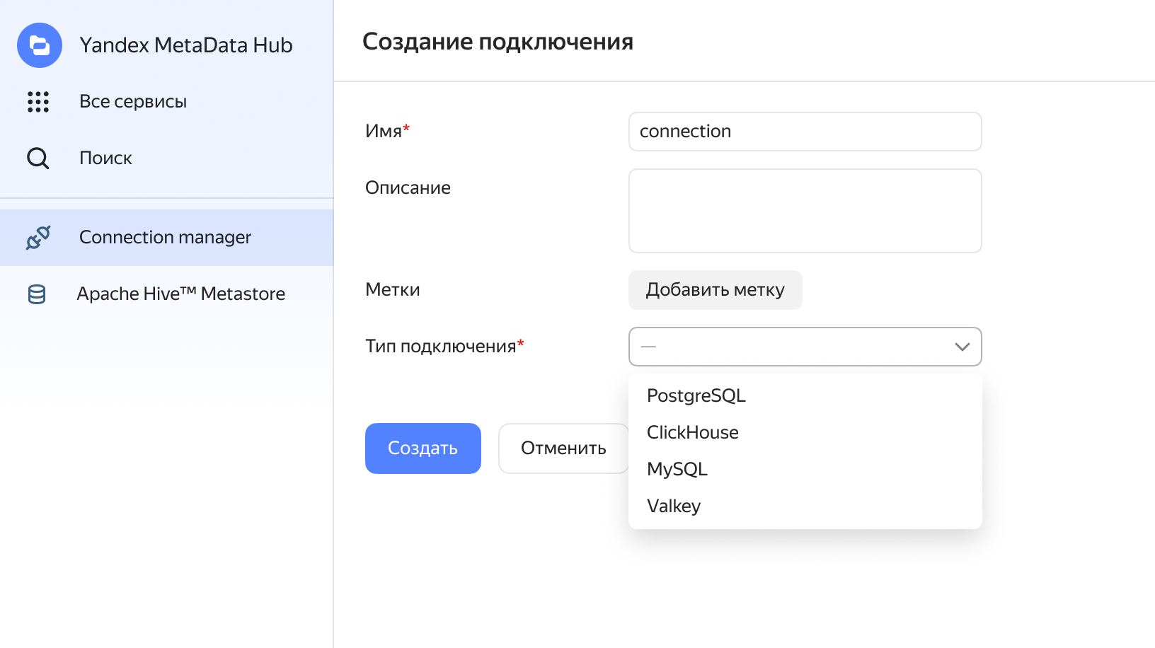 Перейдите в сервис MetaData Hub, далее в раздел Connection Manager.