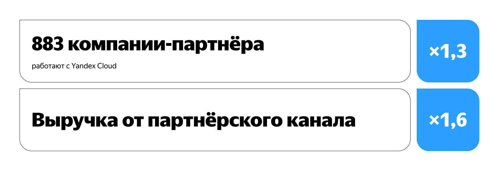 В 2025 году число активных партнёров достигло 883, что в 1,3 раза больше по сравнению с прошлым годом. При этом выручка партнёрского канала выросла в 1,6 раза по сравнению с 2024 годом. Усиление роста выручки связано с более глубокой экспертизой партнёров в продуктах Yandex Cloud и развитием партнёрской программы, в рамках которой мы сотрудничаем с интеграторами, разработчиками, реселлерами и другими компаниями, обладающими сертифицированной экспертизой и опытом реализации проектов на базе платформы.