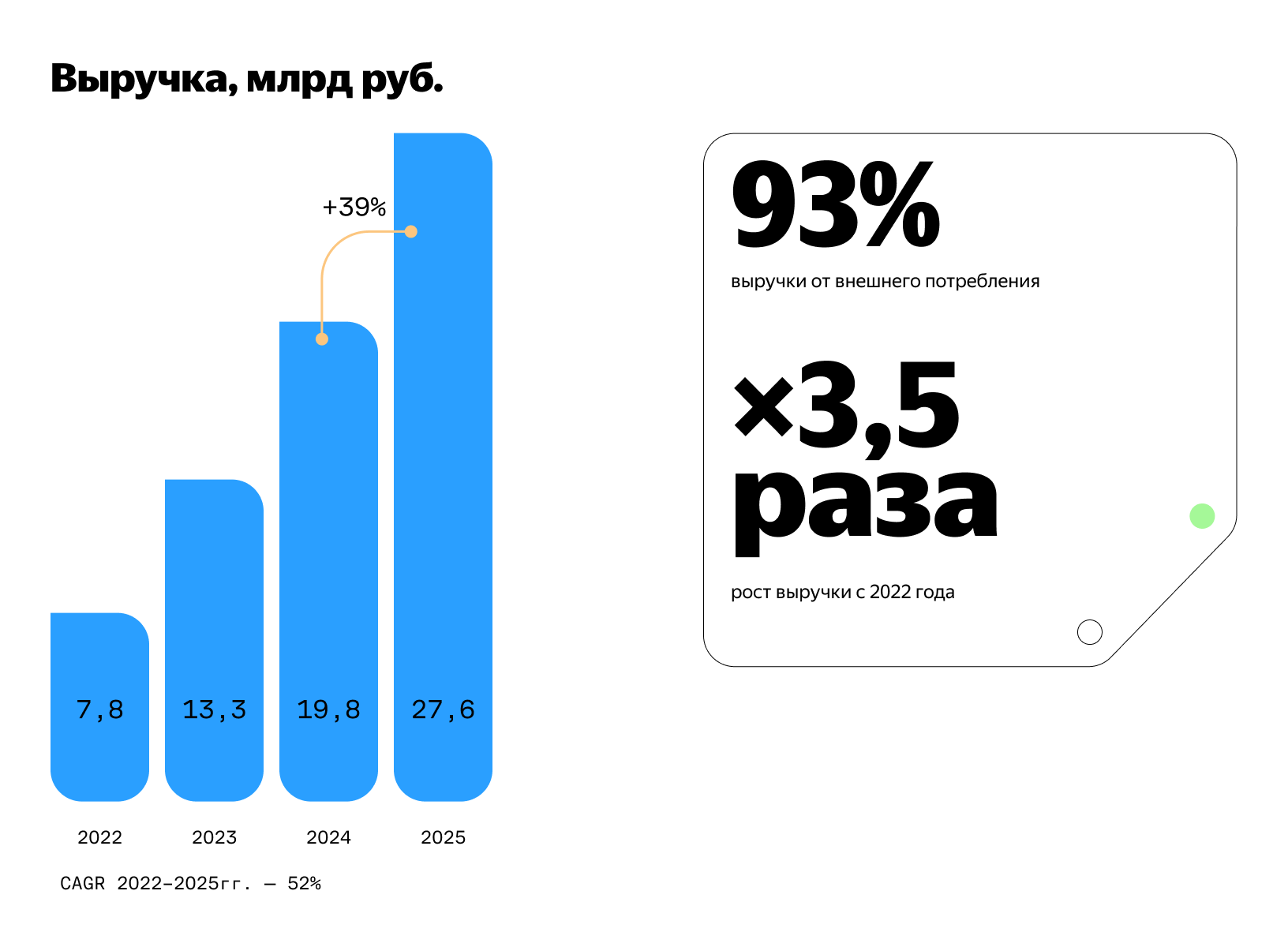 Выручка Yandex Cloud за 2025 год составила 27,6 млрд рублей (на 39% выше показателя предыдущего года и в 3,5 раза выше выручки 2022 года).