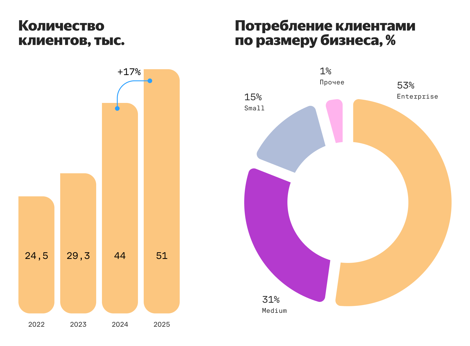 В 2025 году число клиентов Yandex Cloud увеличилось на 17% и достигло 51 тыс. При этом 84% выручки формируется за счёт крупного и среднего бизнеса — это отражает активное использование платформы корпоративными клиентами.