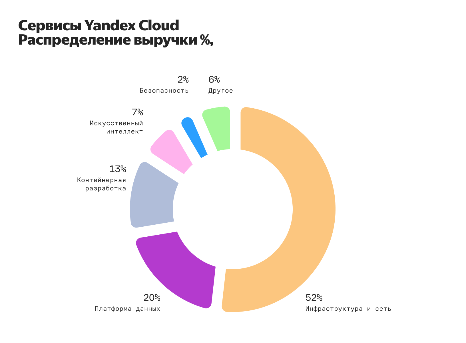 Инфраструктурные сервисы (IaaS) формируют основную часть выручки Yandex Cloud (52%), платформенные сервисы (PaaS) — 42%.