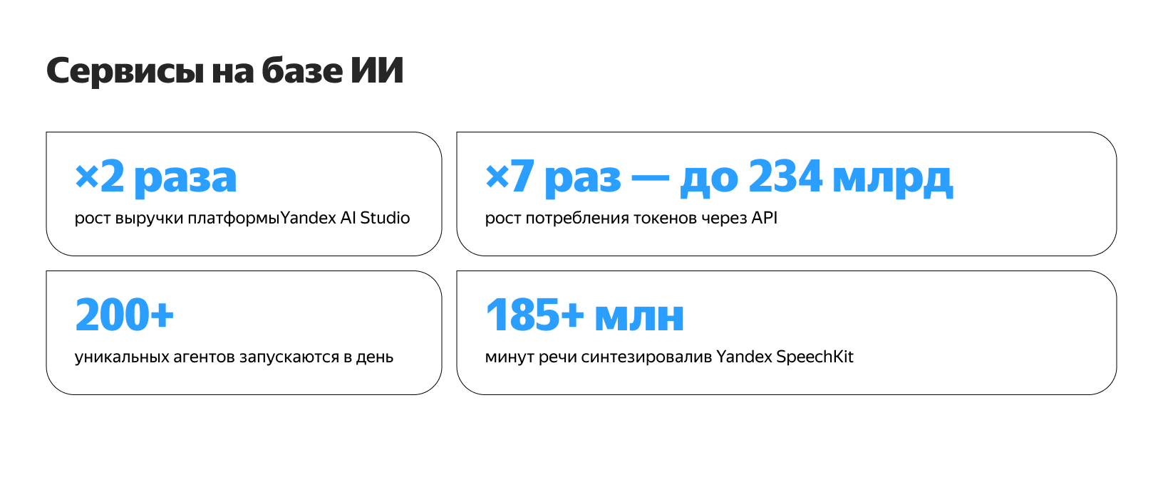 Корпоративные ИИ-сервисы собраны на платформе Yandex AI Studio. В 2025 году выручка платформы почти удвоилась и достигла 2 млрд рублей, значительно опережая рост российского ИИ-рынка (по оценке Yandex B2B Tech и Apple Hills Digital, рост рынка составил 33%).