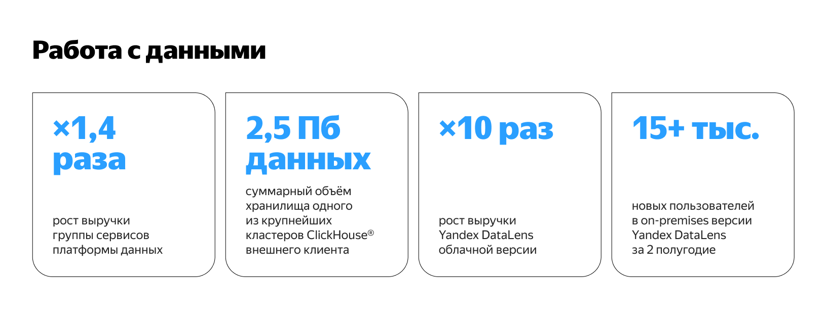 За 2025 год выручка группы сервисов платформы данных выросла в 1,4 раза. Высокую динамику показывают управляемые базы данных: потребление Yandex Managed Service for ClickHouse® увеличилось на 58%, а Yandex Managed Service for PostgreSQL — на 46%. Среди клиентов платформы есть крупные проекты с экстремальными объёмами данных — например, суммарный объём одного из крупнейших кластеров ClickHouse® у внешнего заказчика достиг 2,5 ПБ.