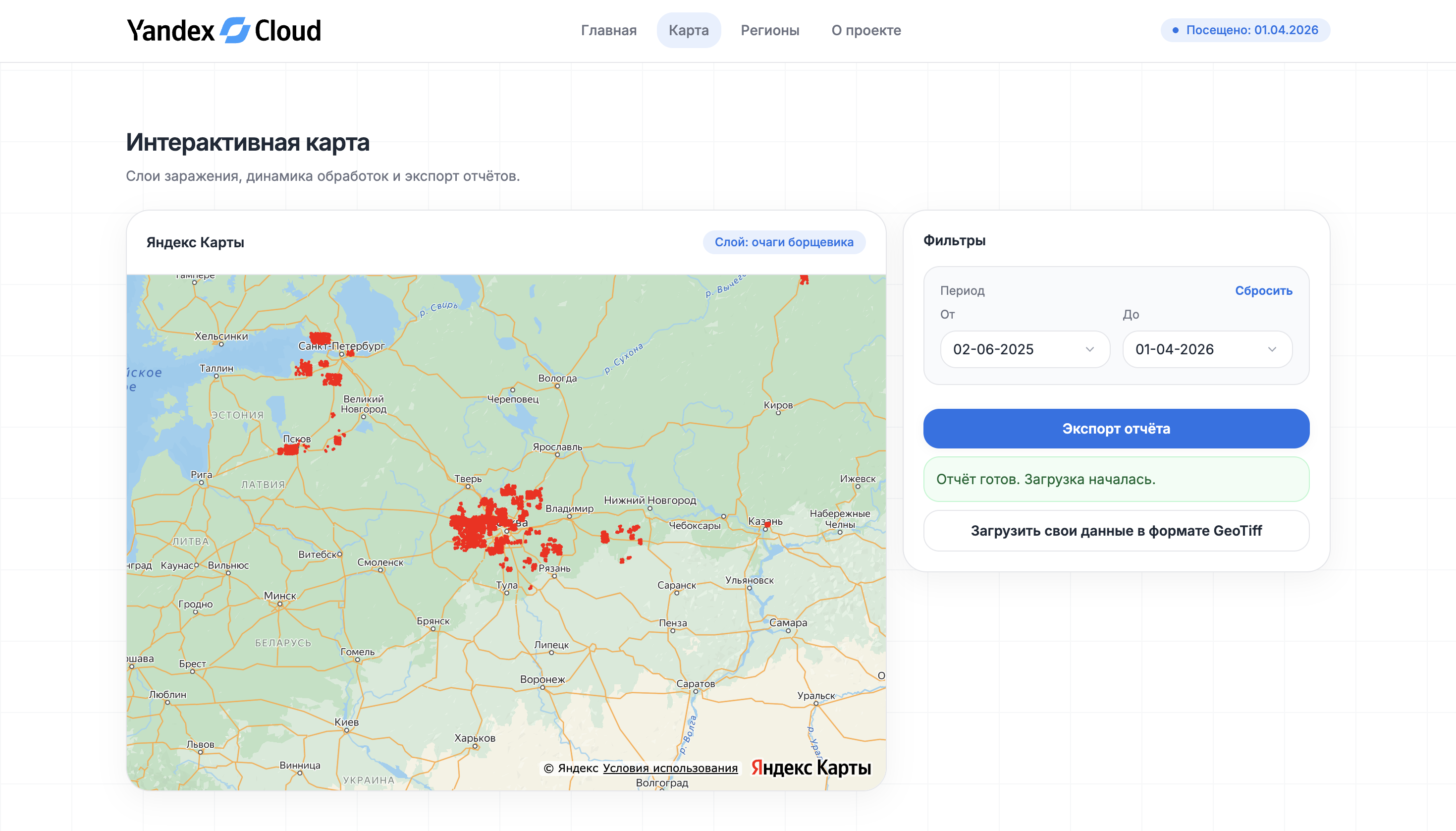 Чтобы найти очаги заражения в других регионах, достаточно загрузить на сайте спутниковые снимки нужной местности в формате GeoTIFF — это исходный формат спутниковых данных с метаданными, который позволяет корректно анализировать территорию. Снимки в этом формате можно найти на общедоступных платформах. Пользователи также могут загружать собственные снимки и таким образом участвовать в развитии сервиса.