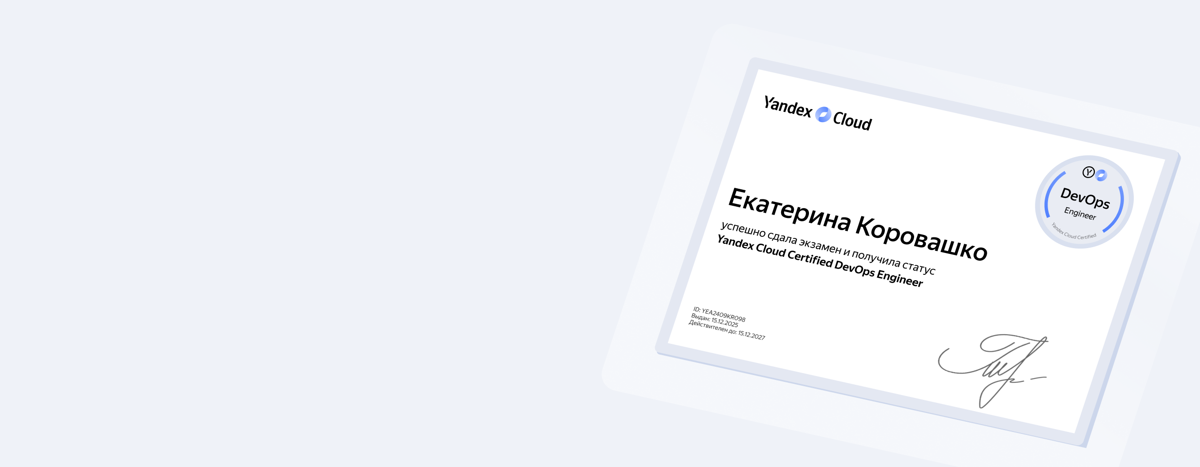 Экзамен для DevOps-инженеров, использующих платформу Yandex Cloud. Подтвердит знания и навыки в области автоматизации управления инфраструктурой, оркестрации контейнеров, настройки CI/CD.