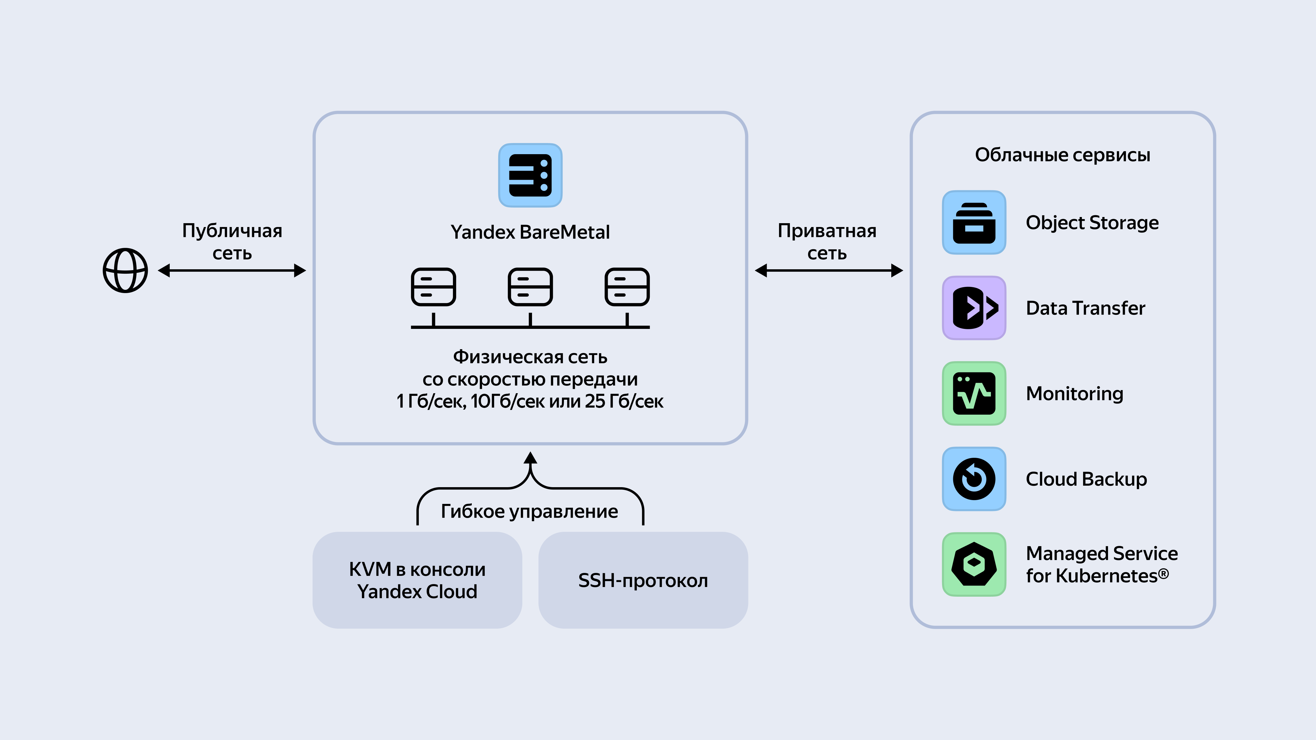 Объединяйте серверы BareMetal с облачной или локальной инфраструктурой с помощью сервиса Cloud Interconnect. Подключайте Cloud Backup для резервного копирования и Managed Service for Kubernetes® для управления кластерами.