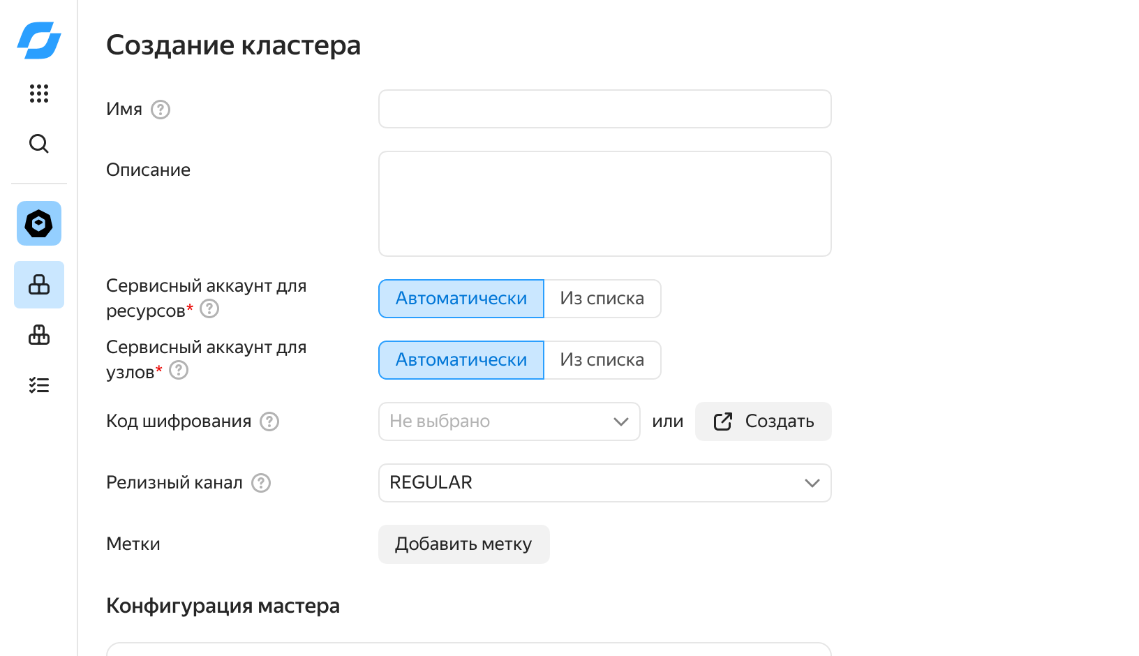 Вы можете выбрать тип мастера: базовый или высокодоступный. Высокодоступный мастер автоматически реплицируется в трёх географически распределённых зонах доступности. Для высокодоступных кластеров гарантируем SLA 99,90% при соблюдении всех условий.
