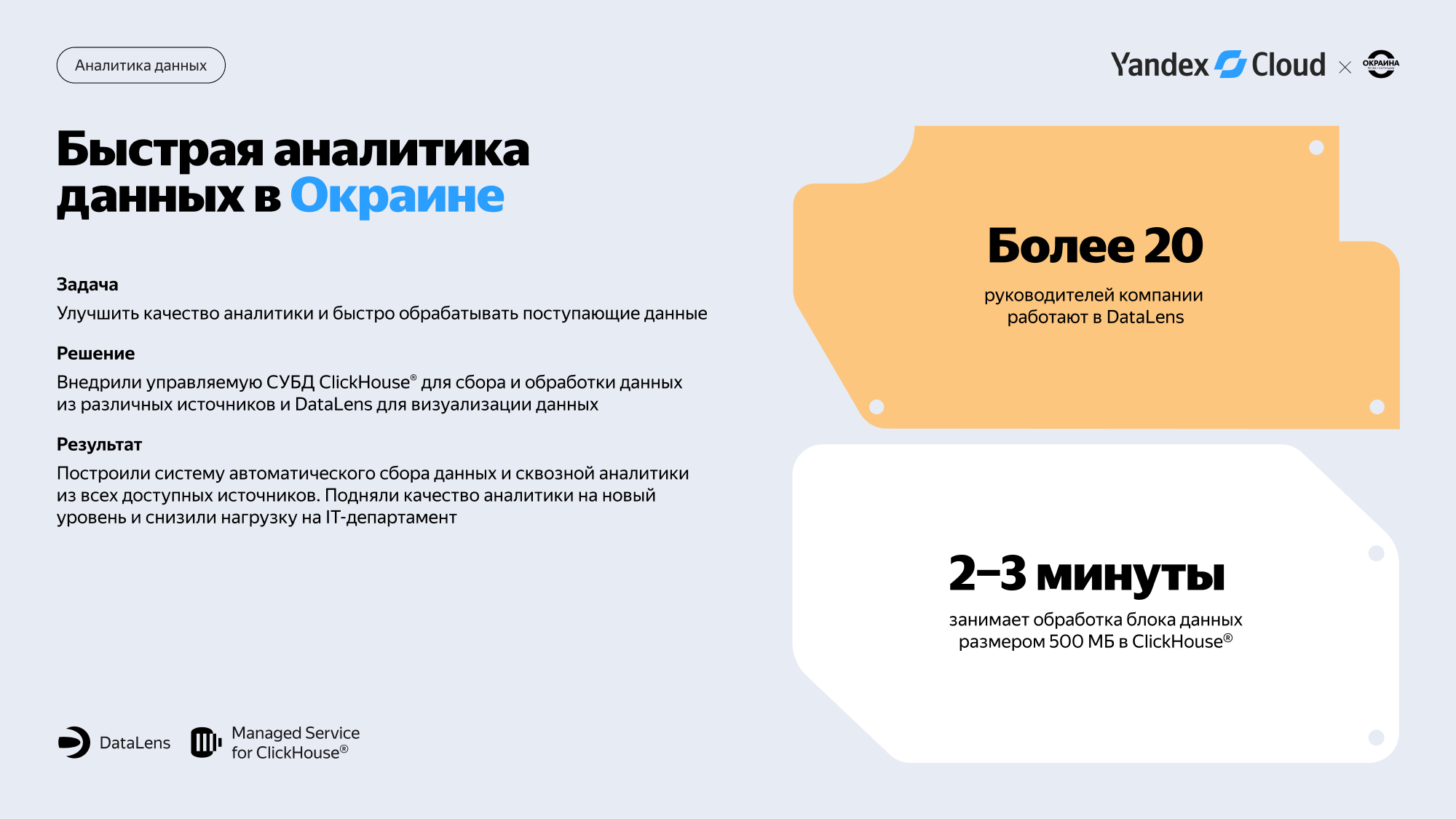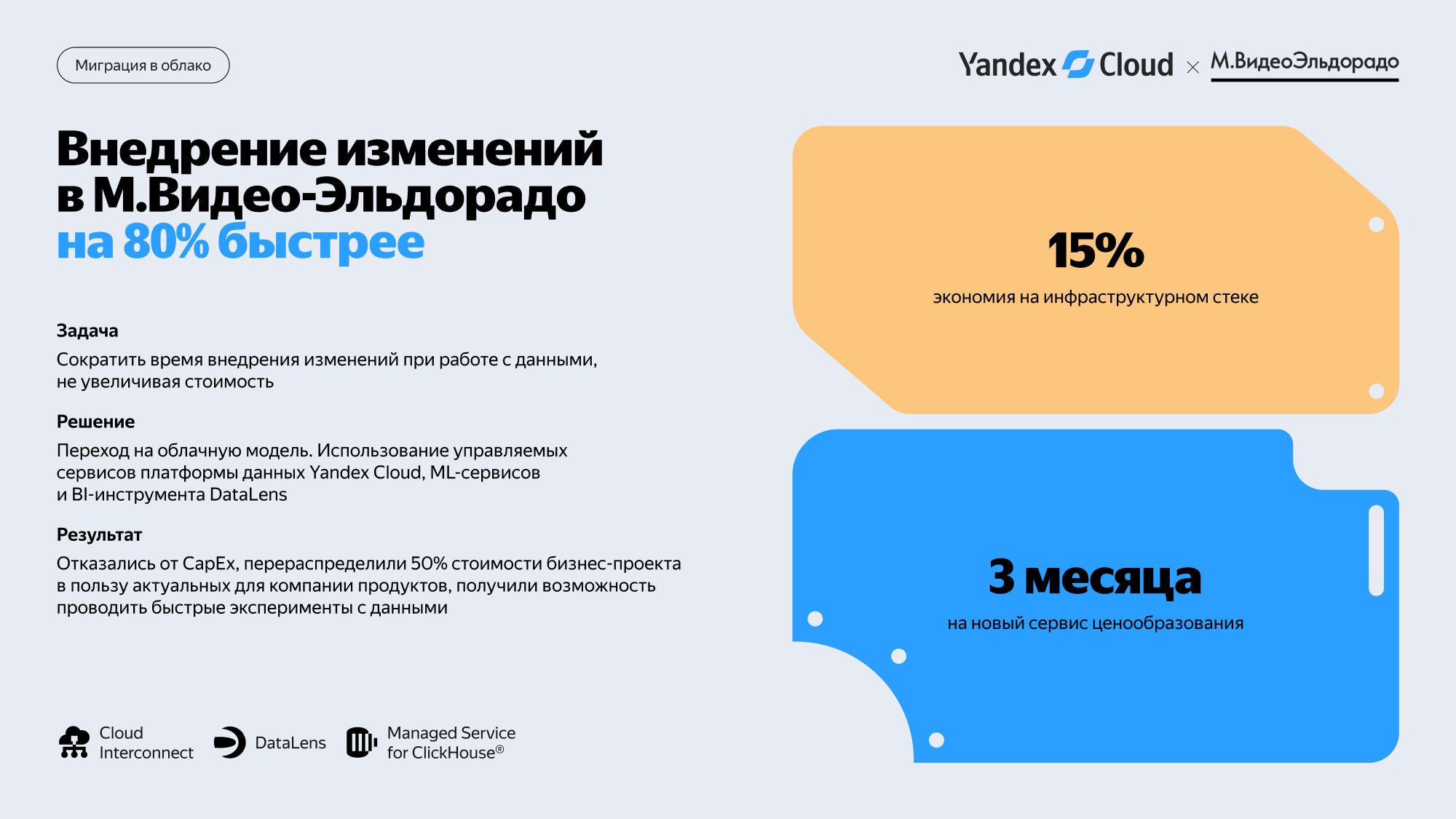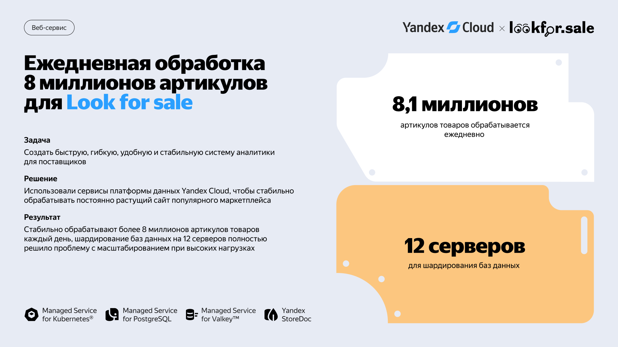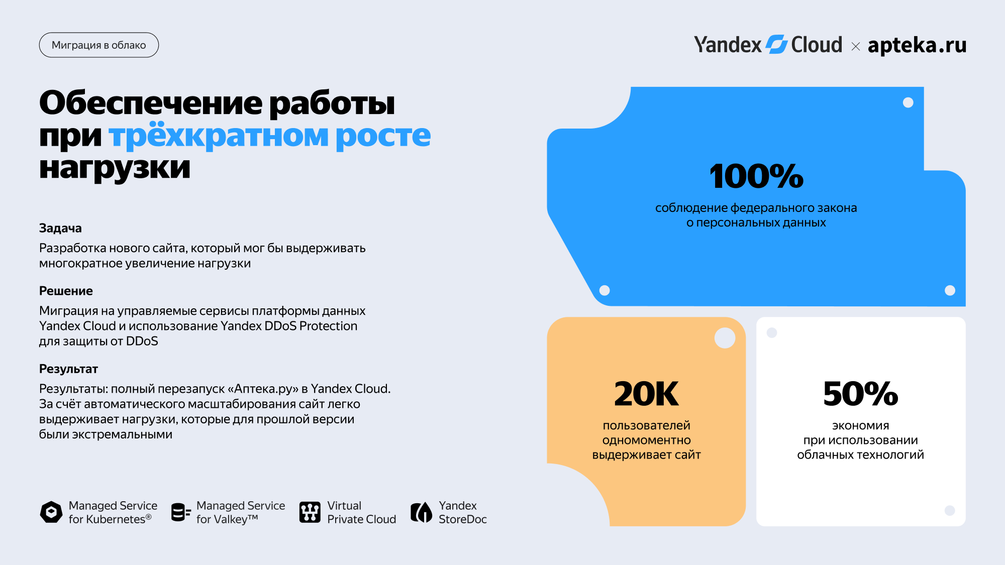 Масштабируемая платформа Yandex Cloud позволяет регулировать количество необходимых ресурсов при пиковой нагрузке и автоматически распределяет трафик между узлами кластера.